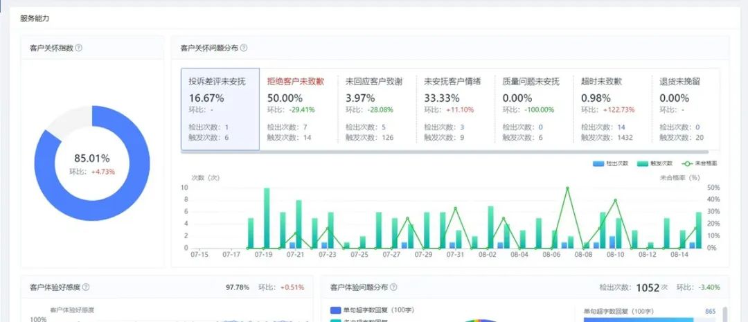 那么我们可以看见图1,其实是围绕客户服务过程中关怀指数,可以看到关怀指数达82%。那这个指数是怎么计算出来的?我们把整个服务的过程节点要拆分得非常细。比如我们针对于消费者的致谢响应、投诉响应,以及未结束聊天的响应等,对这些节点做了打分和算法识别,通过打分更直观展示服务链路中哪些点做得好,哪些需要改进。通过多维数据体系的搭建,为管理者提供了全链路数据看板参考,所有数据都支持查看最底层数据明细,不会遗漏任何细节。