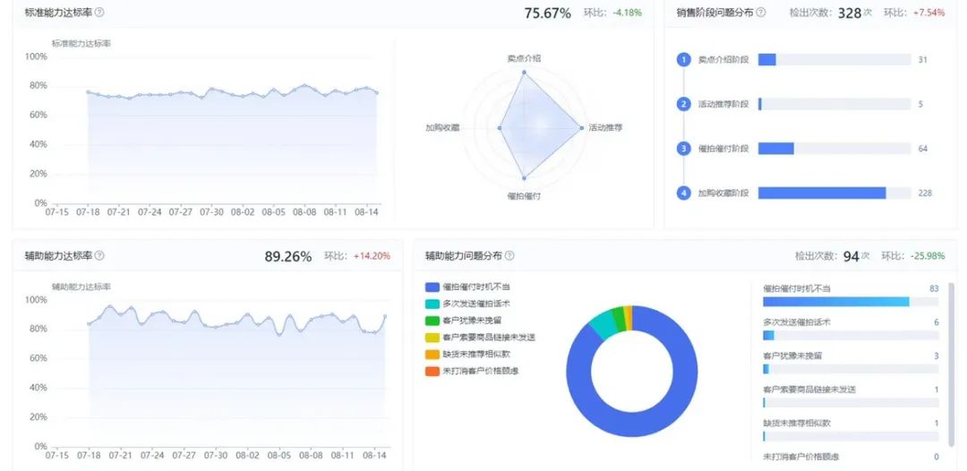 那图2则是标准能力达标率,当客服接到一个消费者的咨询,也就是售前的销售过程。那在这个销售过程中,快麦小智也会对聊天过程进行分析,并搭建客服坐席的能力模型,对客服的销售能力、服务能力等进行打分。管理者可以对客服坐席销售流程进行监控分析,最终提升坐席能力,这也是店小蜜带给快麦小智的能力之一。