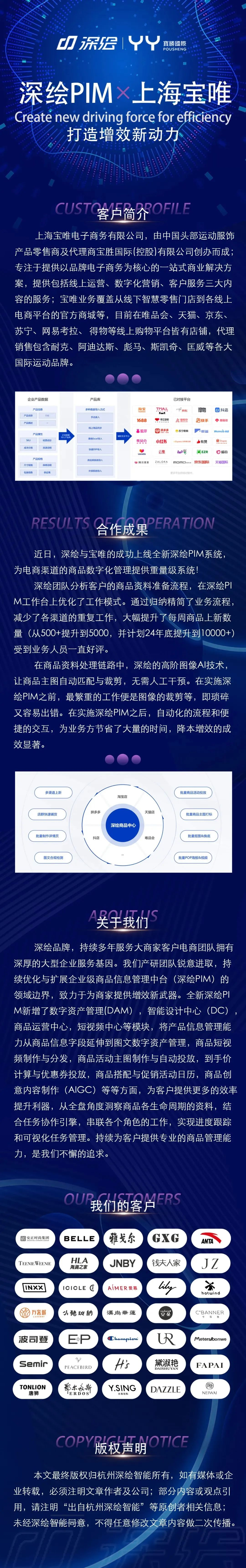 深绘智能为上海宝唯推出的全新深绘PIM系统成功上线。客户电商渠道商品数字化管理注入了“深绘力量”,工作模式大幅优化,降本增效成果卓著。