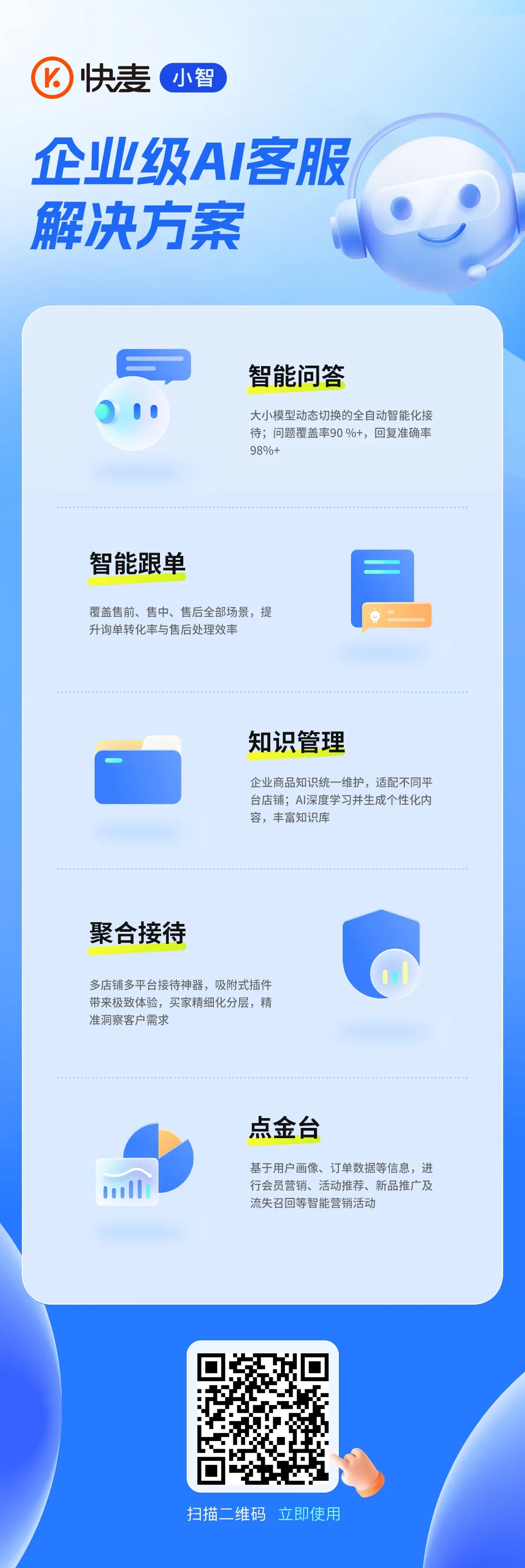 快麦小智基于通义千问大模型、阿里云百炼和自身的算法能力、文档处理能力,将电商行业特性与前沿AI技术深度融合,旨在打造一套全方位、高效率的AI客服机器人。经过了一年的沉淀,快麦小智将陆续解锁大模型各项应用,帮助商家进一步降本增效,通过大模型让智能更智能。